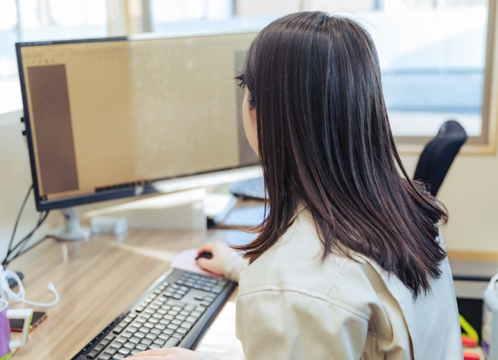 担当業務は、売掛金・買掛金の管理、日々の仕訳処理、税金処理などのお金に関することから、給料計算や社会保険関連の事務まで幅広く行っています。